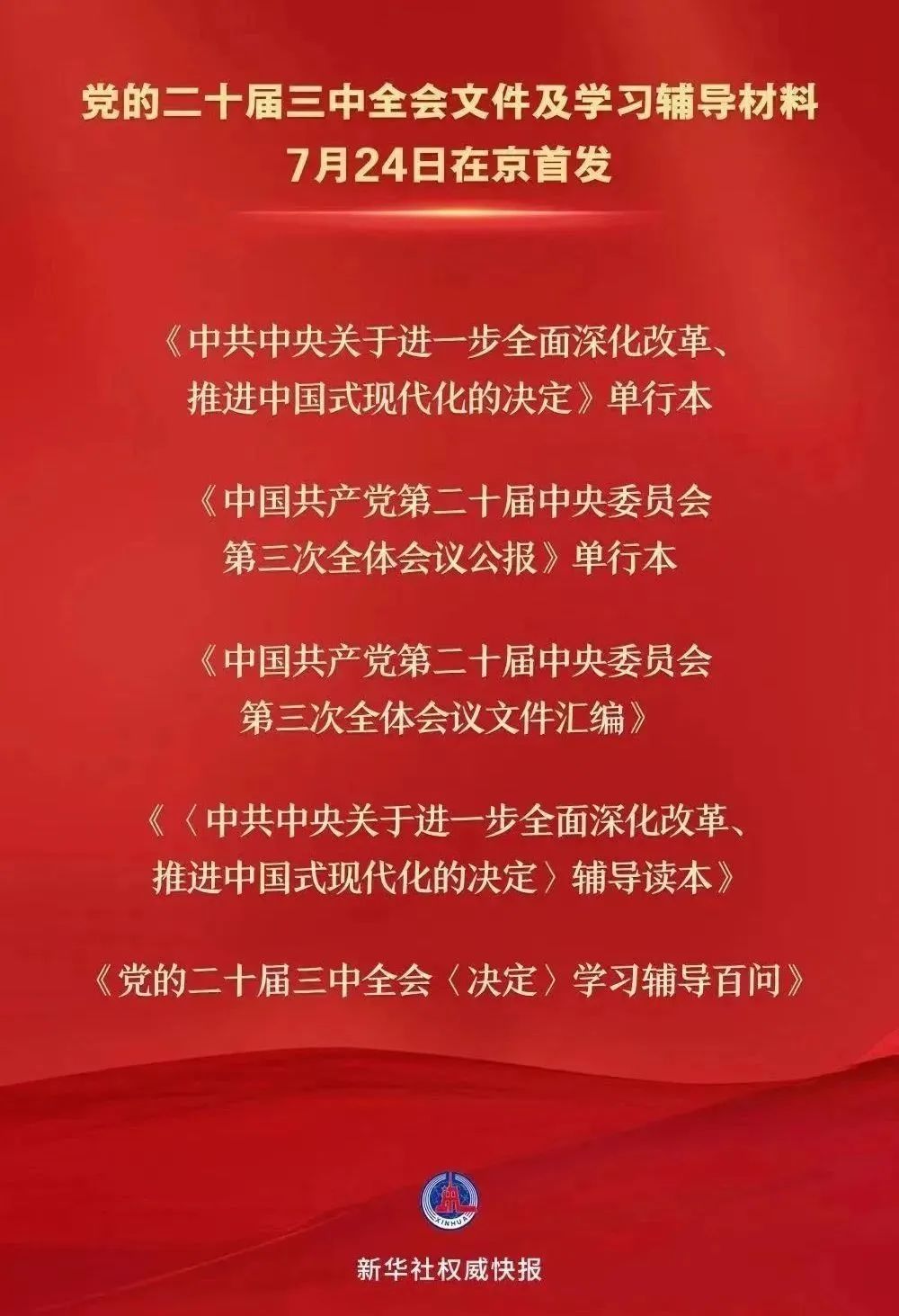 | 黨的二十屆三中全會是在以中國式現(xiàn)代化全面推進(jìn)強(qiáng)國建設(shè)、民族復(fù)興偉業(yè)的關(guān)鍵時(shí)期召開的一次十分重要的會議。全會文件及學(xué)習(xí)輔導(dǎo)材料7月24日在京首發(fā)。由人民出版社、黨建讀物出版社、學(xué)習(xí)出版社共同推出的5種大會文件及學(xué)習(xí)輔導(dǎo)材料與讀者見面,為全國廣大黨員干部群眾深入學(xué)習(xí)貫徹黨的二十屆三中全會精神提供了權(quán)威準(zhǔn)確的讀本。