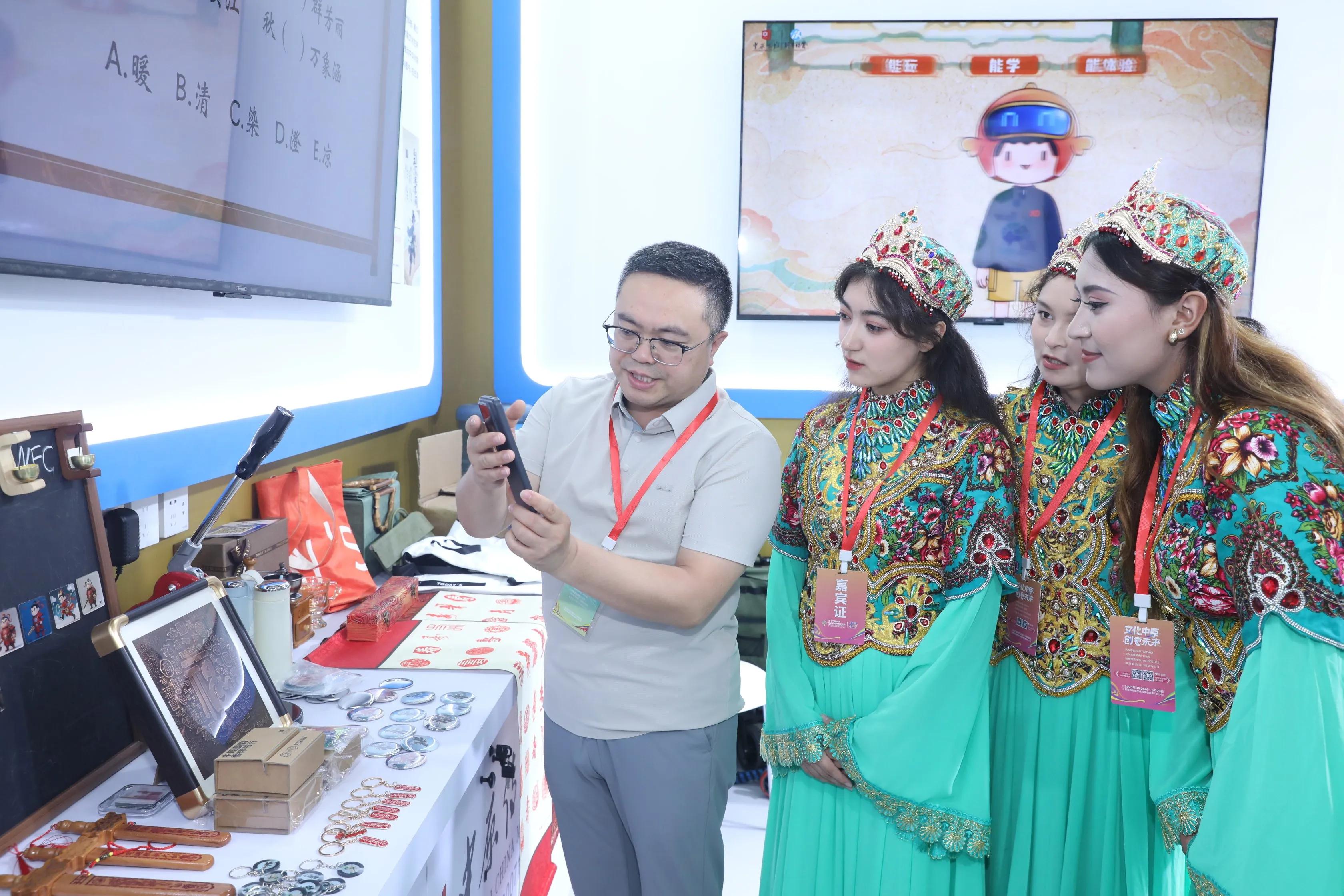 在被展臺上琳瑯滿目的文創(chuàng)產(chǎn)品所吸引的參觀者中,一名掛著“參展商”證件的短發(fā)女孩,拿起河南地圖冰箱貼,仔細(xì)地觀賞著上面的地域文化元素。