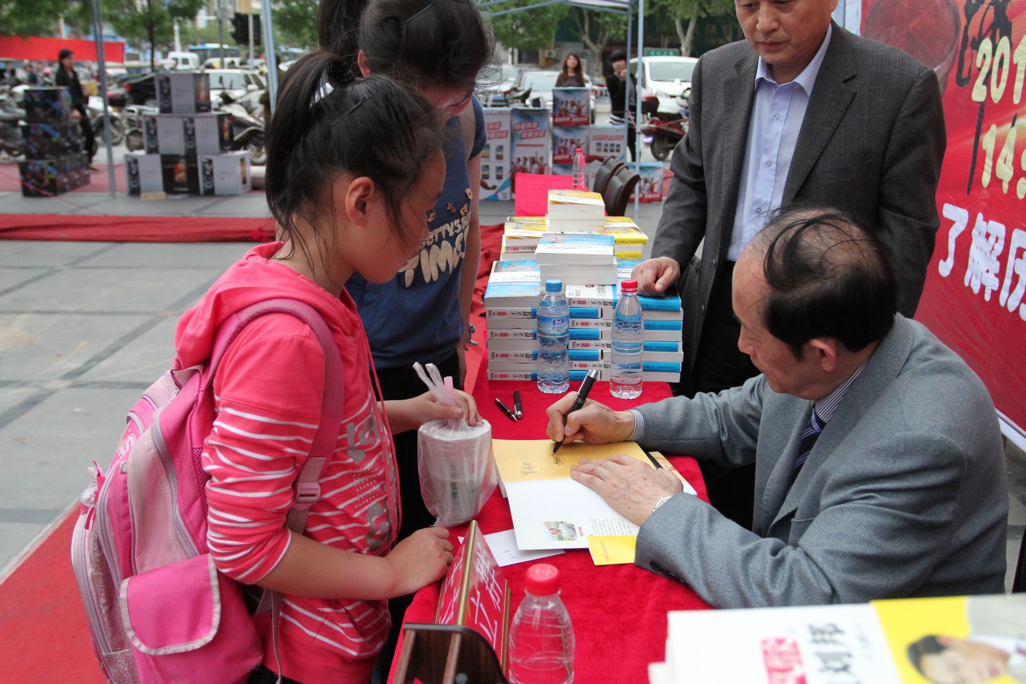 簽售過程中,王立群教授一直耐心與讀者交流,并詳細(xì)詢問讀者的姓名,仔細(xì)的簽在書的扉頁,助手遞到他手上的水都沒顧上喝一口。炎熱的天氣,擋不住讀者的熱情,有些讀者手中少則兩三套書,多則十幾套,他們表示購書簽名是為了送給親戚朋友。“送帶簽名的書不貴,有保存價值、有品位!币晃蛔x者對記者說。有一位老者是王立群教授的忠實(shí)粉絲,他的所有作品全部都有,并且都拿到了現(xiàn)場簽名,老者激動地說:“有幸拿到王立群教授簽過名字的書,太高興了”。原計劃兩個小時的簽售活動,因?yàn)樽x者太多,又延長了半個小時的時間,整個簽售過程共為讀者簽售三百多套圖書。
