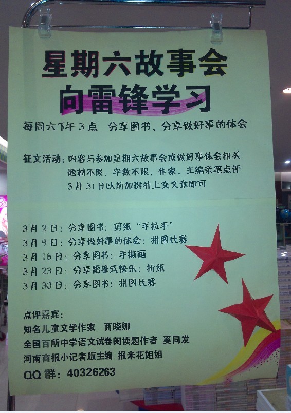 伴隨著春節(jié)長假的遠(yuǎn)去,三月份如期而至,同時(shí)該月又是學(xué)雷鋒月,鄭州市店為大力弘揚(yáng)雷鋒精神,充分利用自身營銷品牌——“星期六故事會”這一平臺,開展為期一個(gè)月的“向雷鋒學(xué)習(xí)”主題活動(dòng)。