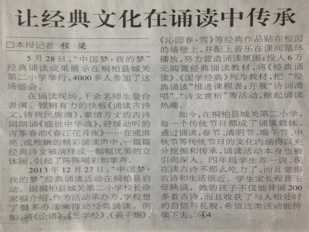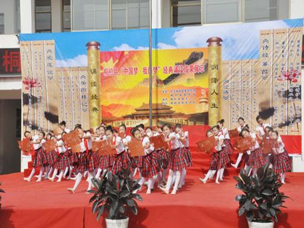2013年12月27日,桐柏縣“中國(guó)夢(mèng)·我的夢(mèng)”經(jīng)典誦讀活動(dòng)啟動(dòng)。此次經(jīng)典誦讀活動(dòng)以桐柏縣店店校聯(lián)辦讀者俱樂(lè)部為平臺(tái),以了解中國(guó)傳統(tǒng)文化、汲取民族智慧為出發(fā)點(diǎn),進(jìn)一步豐富完善讀者俱樂(lè)部的服務(wù)功能,使之真正成為“未成年人思想道德建設(shè)教育基地”。日前,桐柏縣“中國(guó)夢(mèng)·我的夢(mèng)”經(jīng)典誦讀成果展示活動(dòng)在城關(guān)二小舉辦。在誦讀展演中,豐富的表現(xiàn)形式,加上孩子們精彩的誦讀,飽滿的熱情,高昂的激情,充分展現(xiàn)了古詩(shī)文朗誦的藝術(shù)感染力和舞臺(tái)表現(xiàn)力,展現(xiàn)了中華經(jīng)典穿越時(shí)空的恒久魅力。