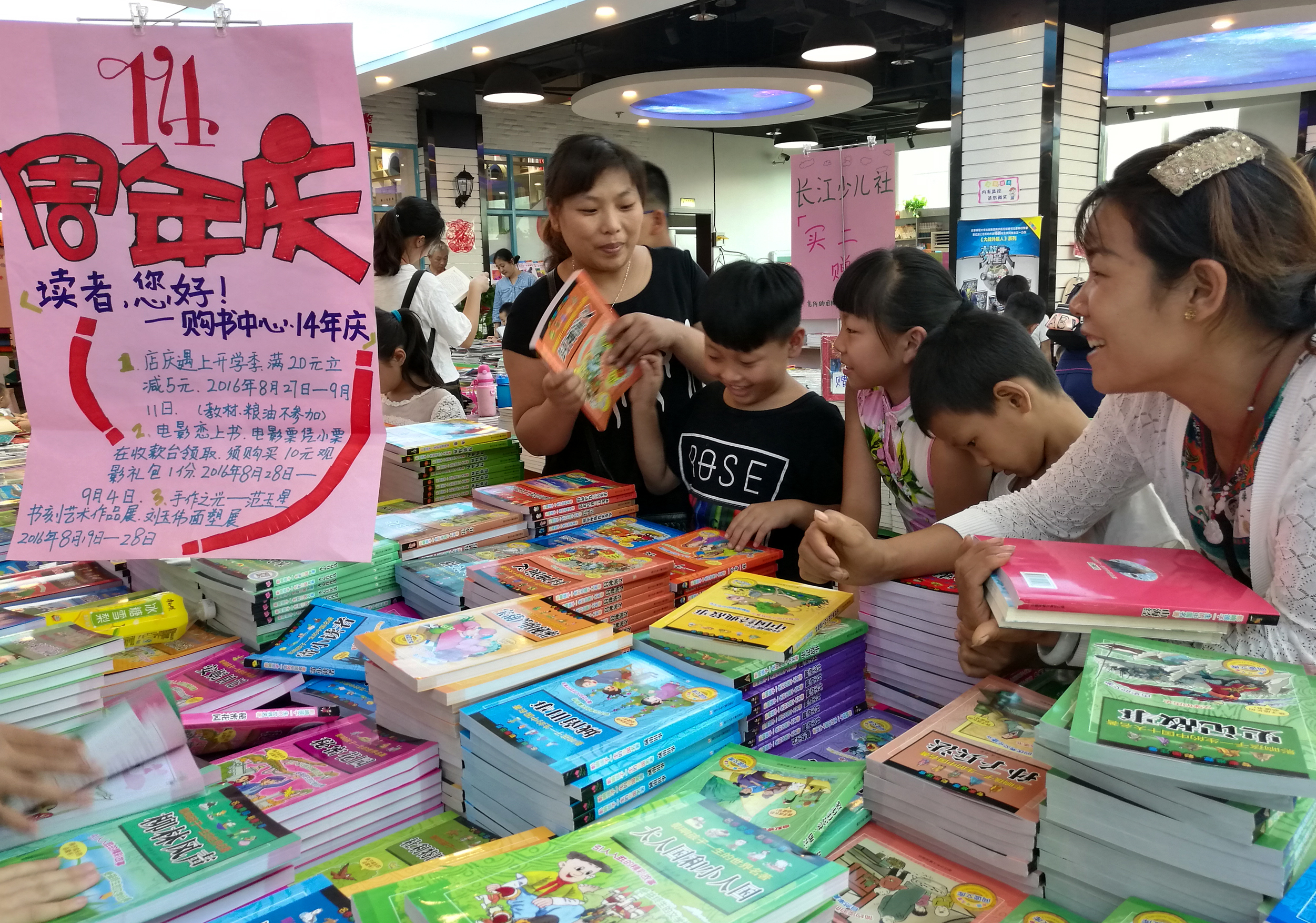 9月10日和11日是新鄉(xiāng)市全市各學校新學期開學后的第一個雙休日,廣大中小學生紛紛利用休息時間來到書店選購新學期適合自己的課外讀物。為了抓住這一銷售良機,新鄉(xiāng)市店購書中心提前著手,通過與有關學校溝通聯(lián)系,了解掌握了小中學生的用書需求,在進貨、備貨方面做到了有的放矢。在營銷方面,從8月28日至9月11日,結合新鄉(xiāng)市店購書中心開業(yè)14周年店慶活動的開展,推出了迎“開學季”主題營銷活動,全場商品滿20減5元,多買多送,將開學期間的熱門、熱銷學生用書及老師推薦用書制成宣傳版面,張貼在賣場入口處,引導學生讀者選購,同時利用微信、短信及顯示屏等平臺對活動進行了有效宣傳,收到了良好效果。