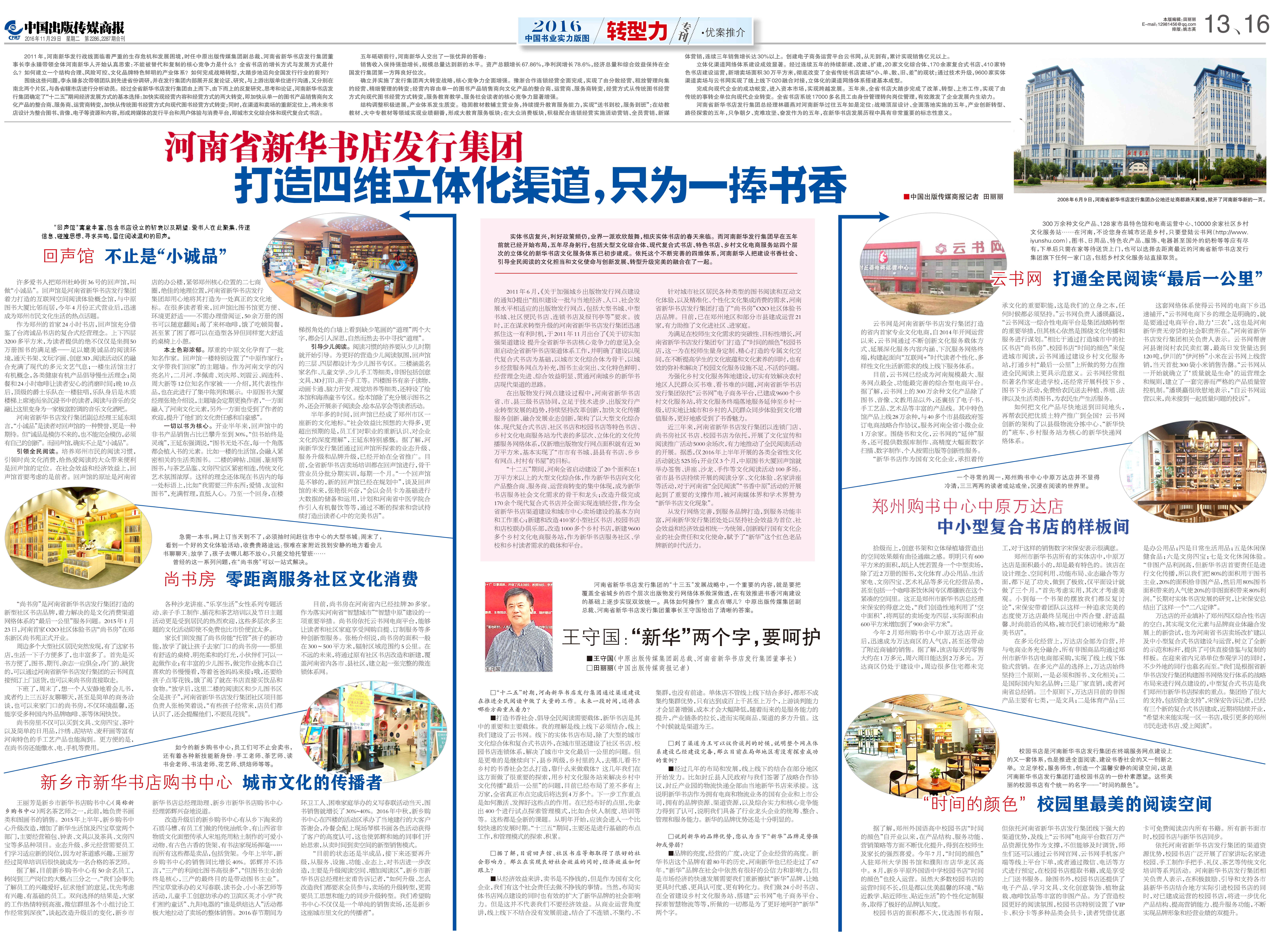 2016年11月29日,中國(guó)出版?zhèn)髅缴虉?bào)在2016中國(guó)書(shū)業(yè)實(shí)力版圖·轉(zhuǎn)型力欄目,以《河南新華書(shū)店發(fā)行集團(tuán)打造四維立體化渠道,只為一捧書(shū)香》為題,專題報(bào)道了河南省新華書(shū)店,向行業(yè)介紹河南省新華書(shū)店多年來(lái)在渠道建設(shè)方面的先進(jìn)發(fā)展經(jīng)驗(yàn)。