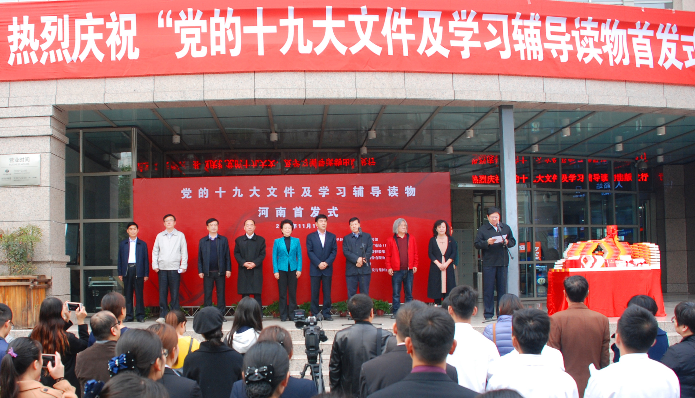 11月1日下午,黨的十九大文件及學(xué)習(xí)輔導(dǎo)讀物河南首發(fā)式在中原圖書大廈隆重舉行。省委常委、宣傳部長趙素萍,省委宣傳部副部長王慶,省新聞出版廣電局局長李宏偉,出版集團(tuán)董事長、黨委書記李永臻,出版集團(tuán)紀(jì)委書記王大瑋,省新聞出版廣電局印刷與發(fā)行管理處處長張保進(jìn),河南人民出版社社長劉曉明,大地傳媒股份公司總經(jīng)理、發(fā)行集團(tuán)總經(jīng)理林疆燕,大地傳媒股份公司總編輯、河南人民出版社總編輯耿相新,發(fā)行集團(tuán)黨委書記宋保安出席首發(fā)式。首發(fā)式由出版集團(tuán)總裁、副董事長、黨委副書記郭元軍主持。首先,劉曉明社長向大家介紹了十九大文件及學(xué)習(xí)輔導(dǎo)讀物在河南的出版印制情況。隨后,出席首發(fā)式的領(lǐng)導(dǎo)向各單位代表贈(zèng)送了十九大文件及學(xué)習(xí)輔導(dǎo)讀物。王慶副部長在講話中強(qiáng)調(diào),認(rèn)真學(xué)習(xí)宣傳、貫徹落實(shí)黨的十九大精神是當(dāng)前和今后一段時(shí)期全省首要的政治任務(wù)。各單位要以高度的政治責(zé)任感、使命感,認(rèn)真做好十九大文件及學(xué)習(xí)輔導(dǎo)讀物的出版發(fā)行、宣傳征訂工作,要精心組織、周密安排、細(xì)化任務(wù)、壓實(shí)責(zé)任,確保廣大讀者能夠及時(shí)讀到十九大文件及學(xué)習(xí)輔導(dǎo)讀物。首發(fā)式結(jié)束后,趙素萍部長等領(lǐng)導(dǎo)來到中原圖書大廈一樓“十九大黨政理論讀物專題展臺(tái)”前,認(rèn)真翻閱十九大文件及學(xué)習(xí)輔導(dǎo)讀物,對(duì)下一步十九大文件及學(xué)習(xí)輔導(dǎo)讀物的推廣工作做出了重要指示。