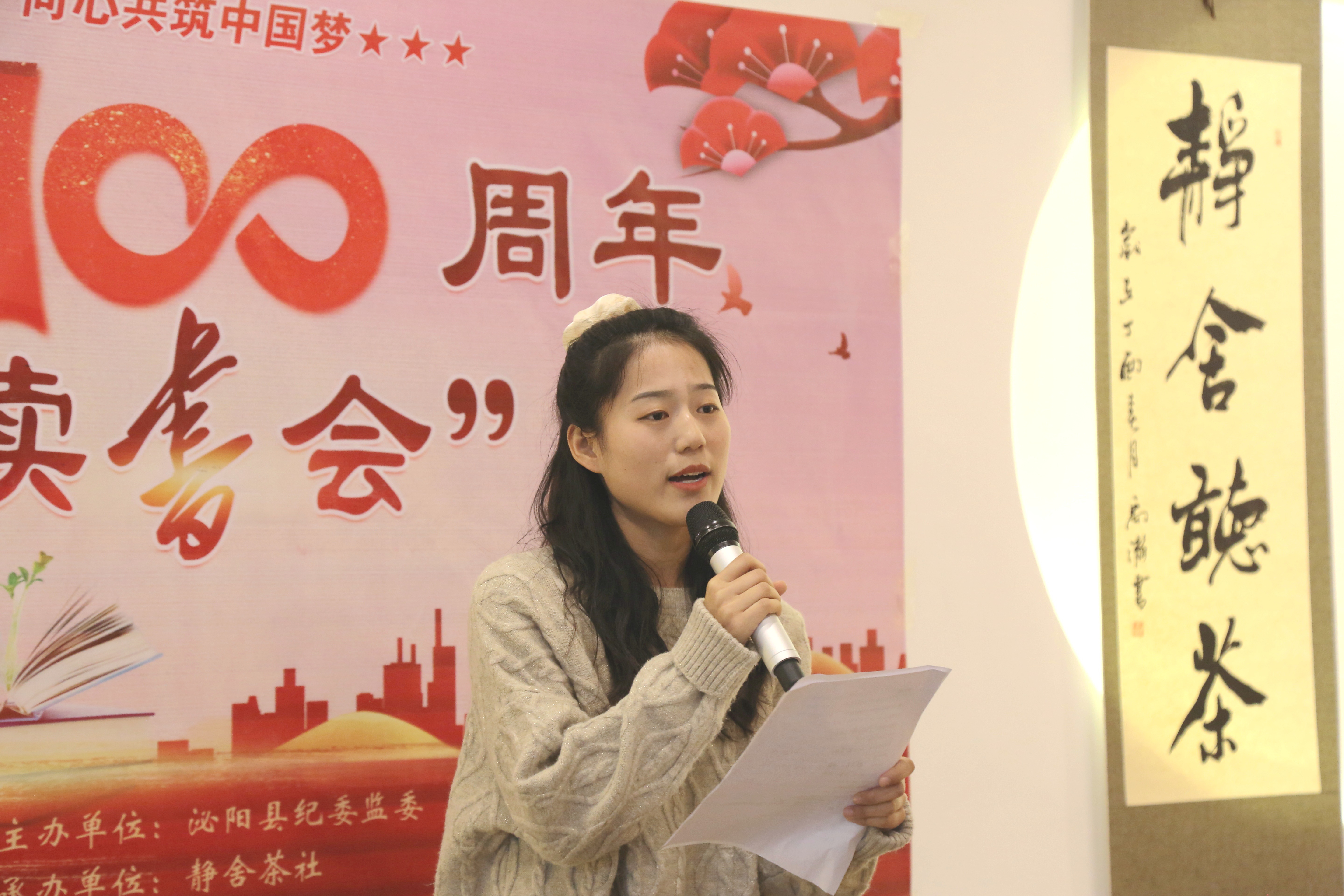 在讀書會上,泌陽縣紀監(jiān)委姚海洋同志介紹了泌陽縣焦竹園中共鄂豫邊革命根據地紅色歷史以及泌陽縣反腐倡廉宣教基地情況。縣紀監(jiān)委王茜同志講述了“信仰的力量”—河南英模風采錄講述革命先烈陳香齋的感人故事《沖鋒陷陣鄂豫邊》;盤古星口才班主持人深情地講述了《趙一曼的故事》;新華書店的李杰朗誦了《黨是我心中明星》革命先烈的故事;文聯(lián)主席劉藝同志朗誦了王蒙的《青春萬歲》;“靜舍書茶社”劉靜同志朗誦了《我驕傲 我是中國人》;王沛和禹巖分別朗誦了自己寫的紅色詩篇和革命詩歌;融媒體中心記者于樂千同志朗誦了《長征》;縣農商銀行呂獻凱同志朗誦了革命詩歌;小朋友朗誦詩歌《延安,我把你追尋》等。